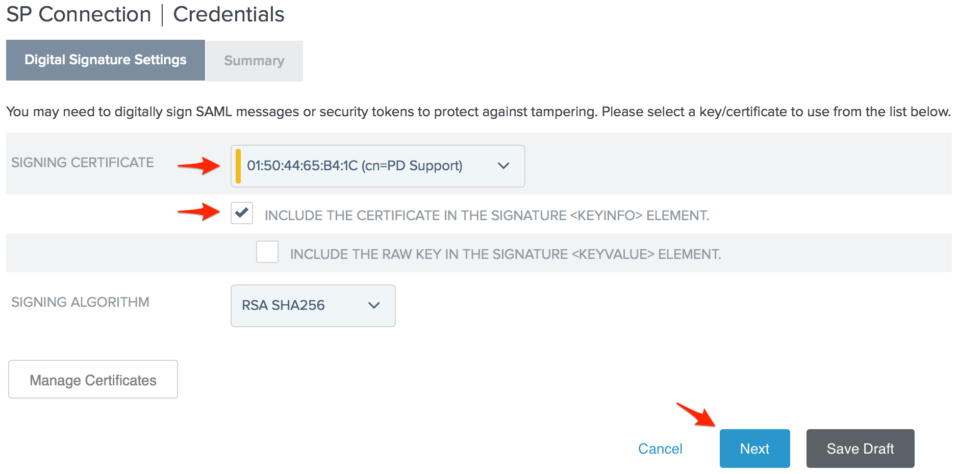 - Select the Signing Certificate you want to use with PagerDuty. The serial number you noted in step 4 will help you identify the correct certificate. Check Include the certificate in the signature <keyinfo> element and click Next.