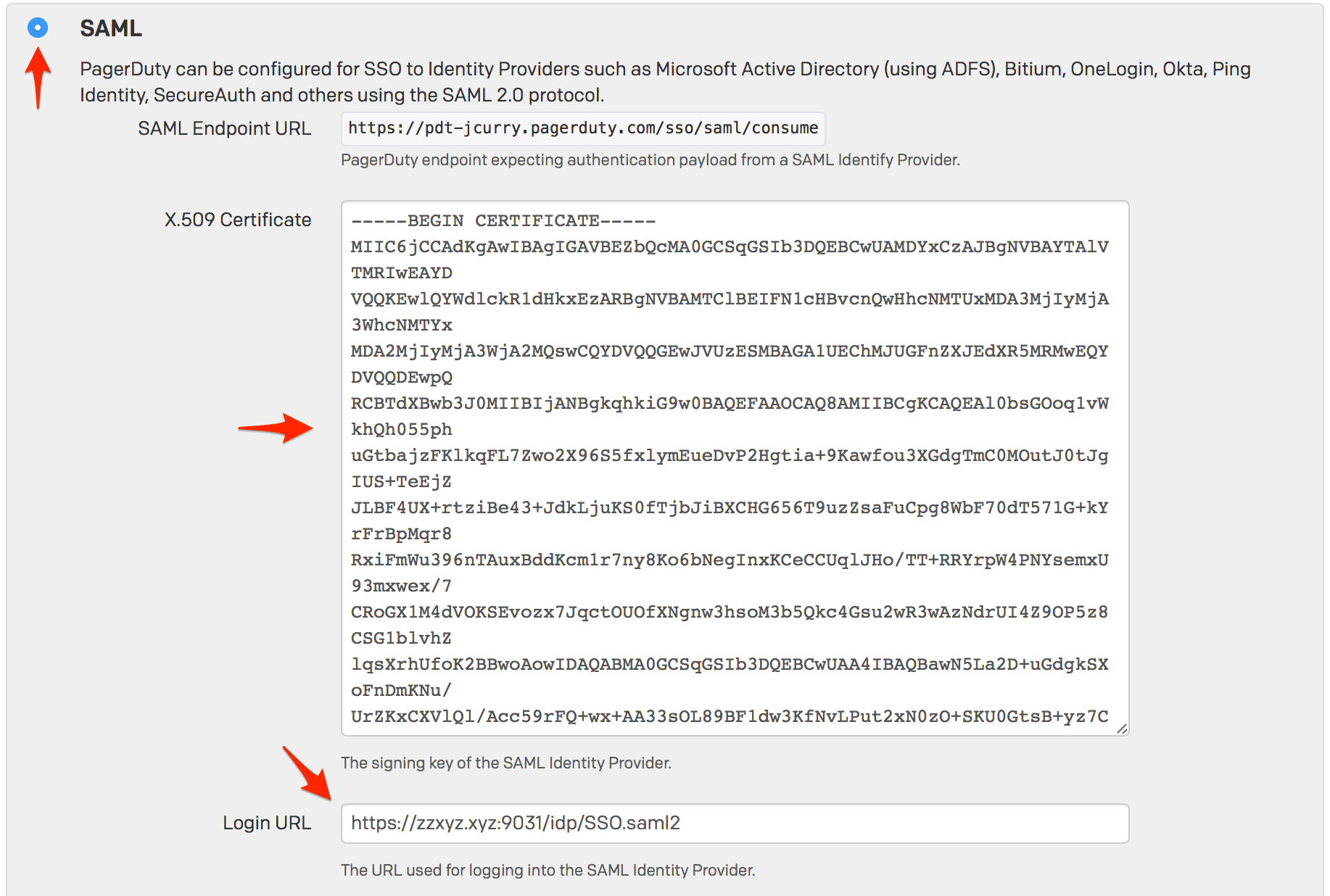 - Click the SAML radio button to configure Single Sign On in PagerDuty. Copy the content of the certificate file you downloaded in step 6 and paste it into the X.509 Certificate field, then enter your PingFederate server's SAML endpoint in the Login URL field.