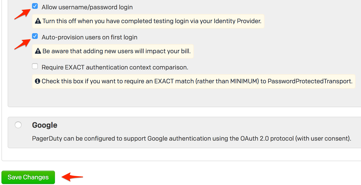 Even with username and password authentication disabled for users, the Account Owner will always be able to login with their username and password as a backup option should you need to change the SSO configuration or disable it completely.
