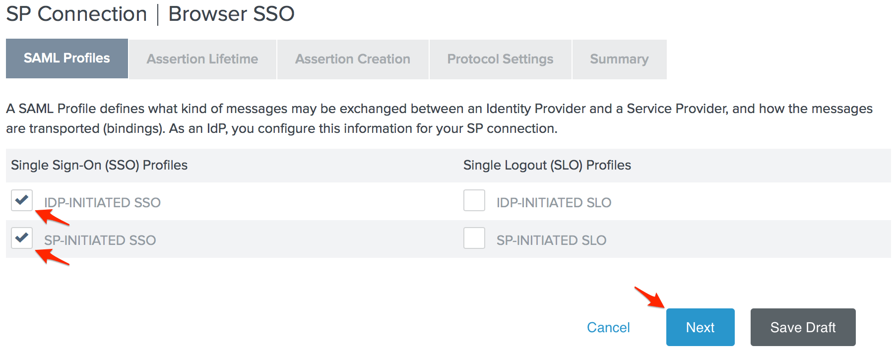 - Check the IdP-Initiated SSO and SP-Initiated SSO options on the SAML Profiles page, then click Next.