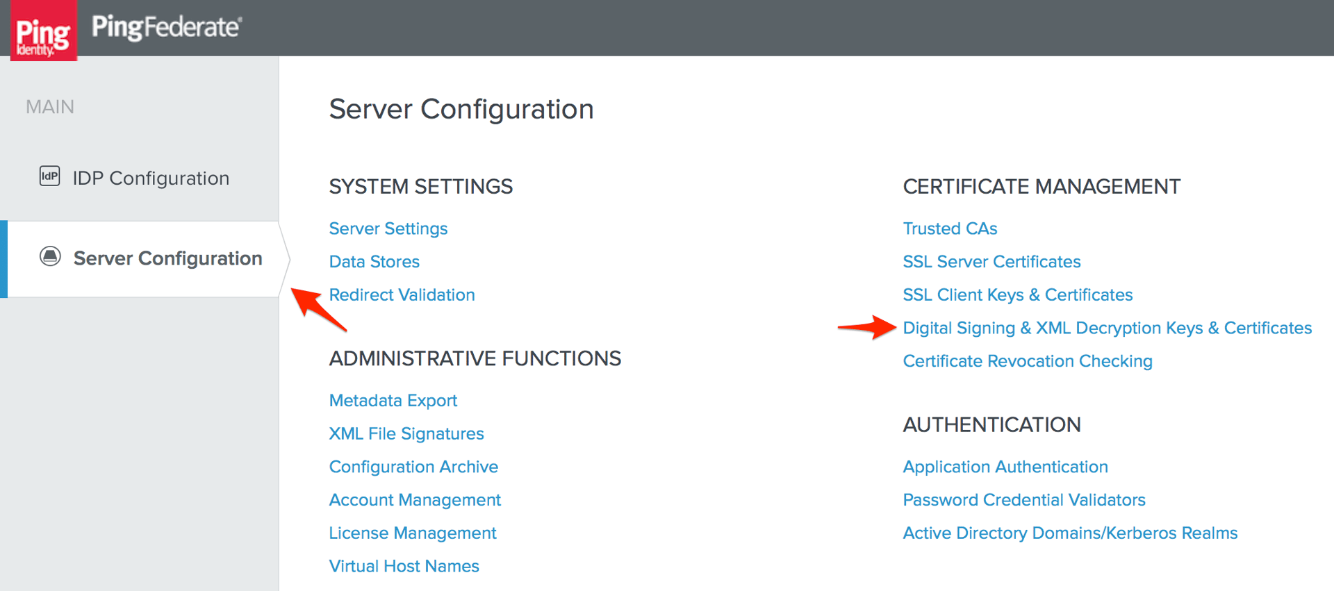 - Log in to PingFederate and go to the Server Configuration page, then click Digital Signing & XML Decryption Keys & Certificates.