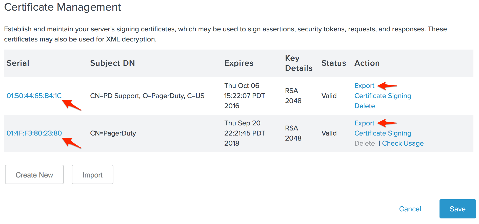 - Note the Serial number of the certificate you want to use with PagerDuty, as you will refer this number in a later step, then click Export.