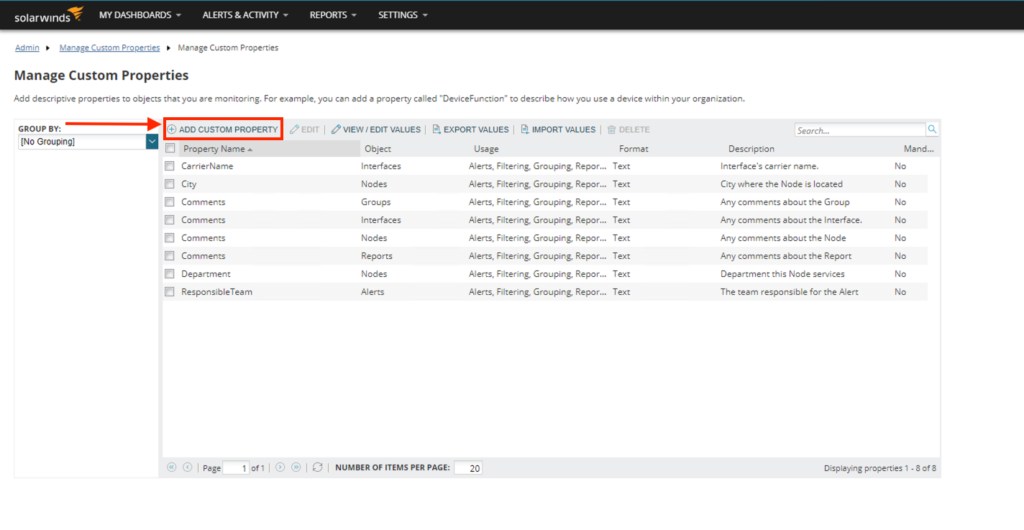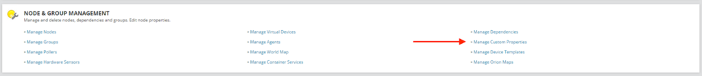 - Log in to SolarWinds as an admin, then go to the Settings menu and select All Settings (or click Settings in the top right corner of the page if you have an older version of SolarWinds). Click Manage Custom Properties under the Node & Group Management section.