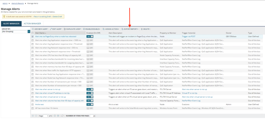 - Next, click Export/Import to import some of the most popular alerts we’ve created templates for. Click Import Alert and select the alert definitions you would like to import to SolarWinds from the extracted Sample Alerts location.