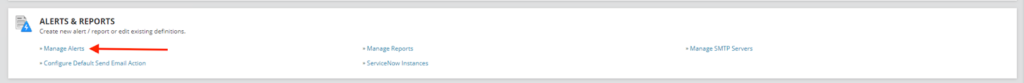 - Navigate back to the Main Settings & Administration page in SolarWinds Orion by going to the Settings menu and selecting All Settings (or click Settings in the top right corner of the page if you have an older version of SolarWinds). Click Manage Alerts under the Alerts & Reports section.