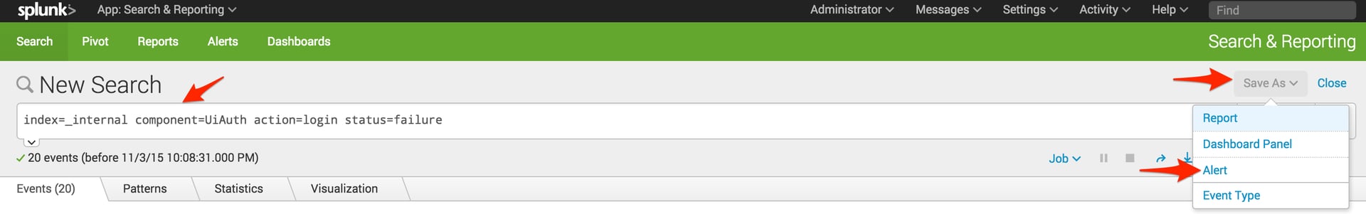 6. Run the search in Splunk that you would like to create an alert for. We recommend testing by searching Splunk’s internal logs for failed login attempts: index=_internal component=UiAuth action=login status=failure</code >