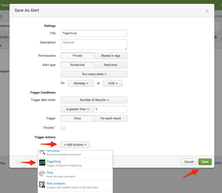 - Add a Title for the new alert, specify the conditions under which you'd like it to trigger an alert and add a new Trigger Action. Select PagerDuty as the trigger action type. By default, this will notify the integration URL you established when you set up the PagerDuty app.