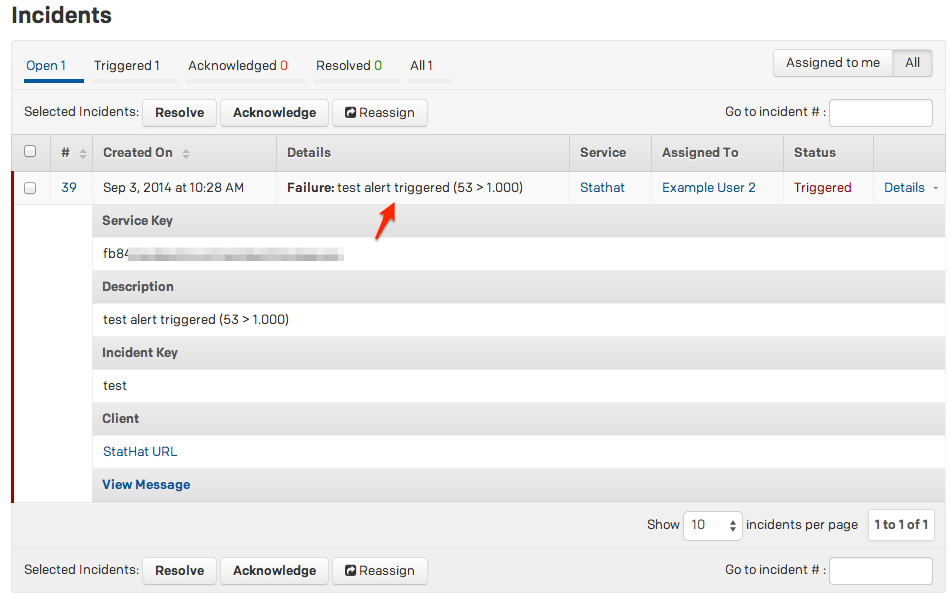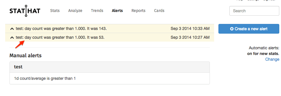 Your setup is complete! You will now see Stathat alerts as triggered incidents in your PagerDuty dashboard. Here are some example alerts on my 'test' stat in Stathat (language libraries for Stathat can be found here):