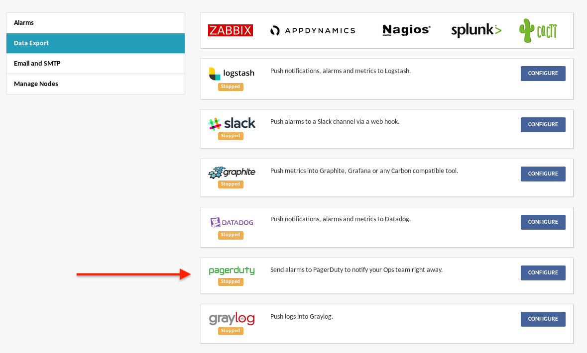 - Select Data Export, find the PagerDuty option and click the Configure button.