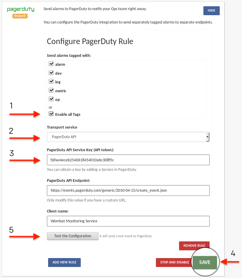 - Select Enable all tags in the Send alarms tagged with section and select the PagerDuty API as the Transport Service. Then paste the Integration Key (generated in the In PagerDuty section above) in the PagerDuty API Service Key (API token) field. Click Save and then click the Test the Configuration button