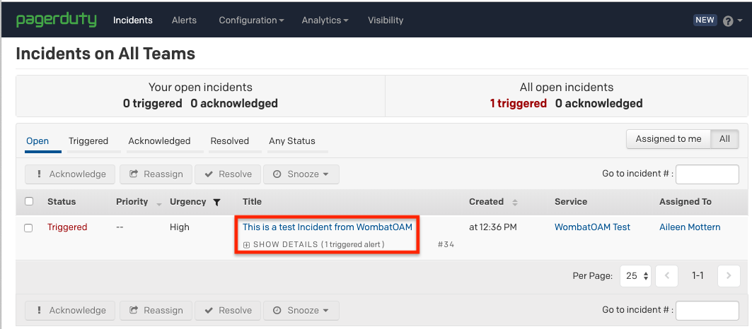 - You should then receive a This is a test incident from WombatOAM incident in your PagerDuty instance. If you do not receive this incident, please ensure that you have input the Integration Key correctly and try again.