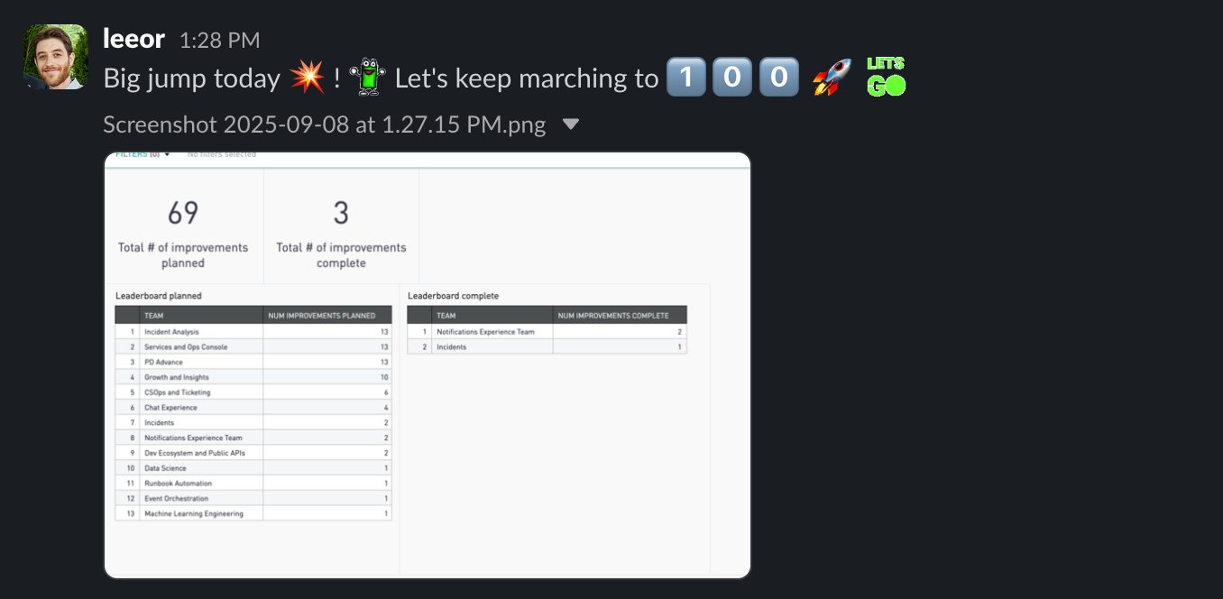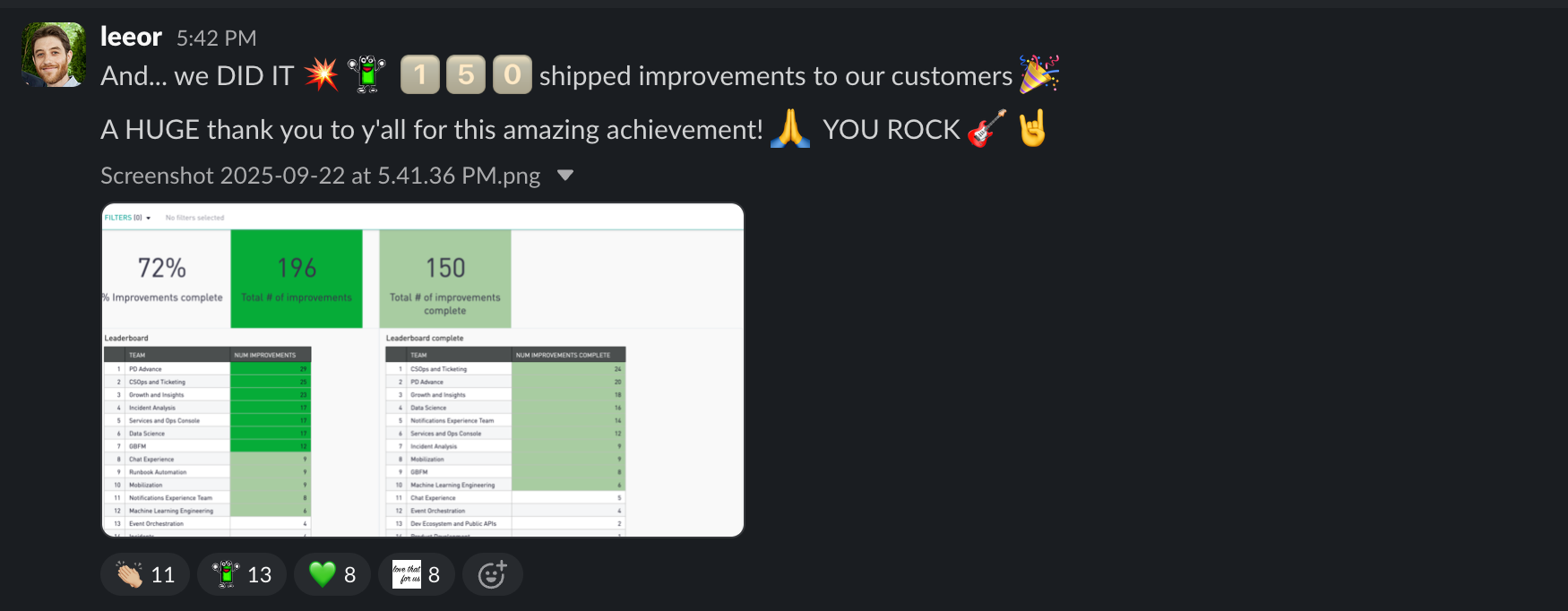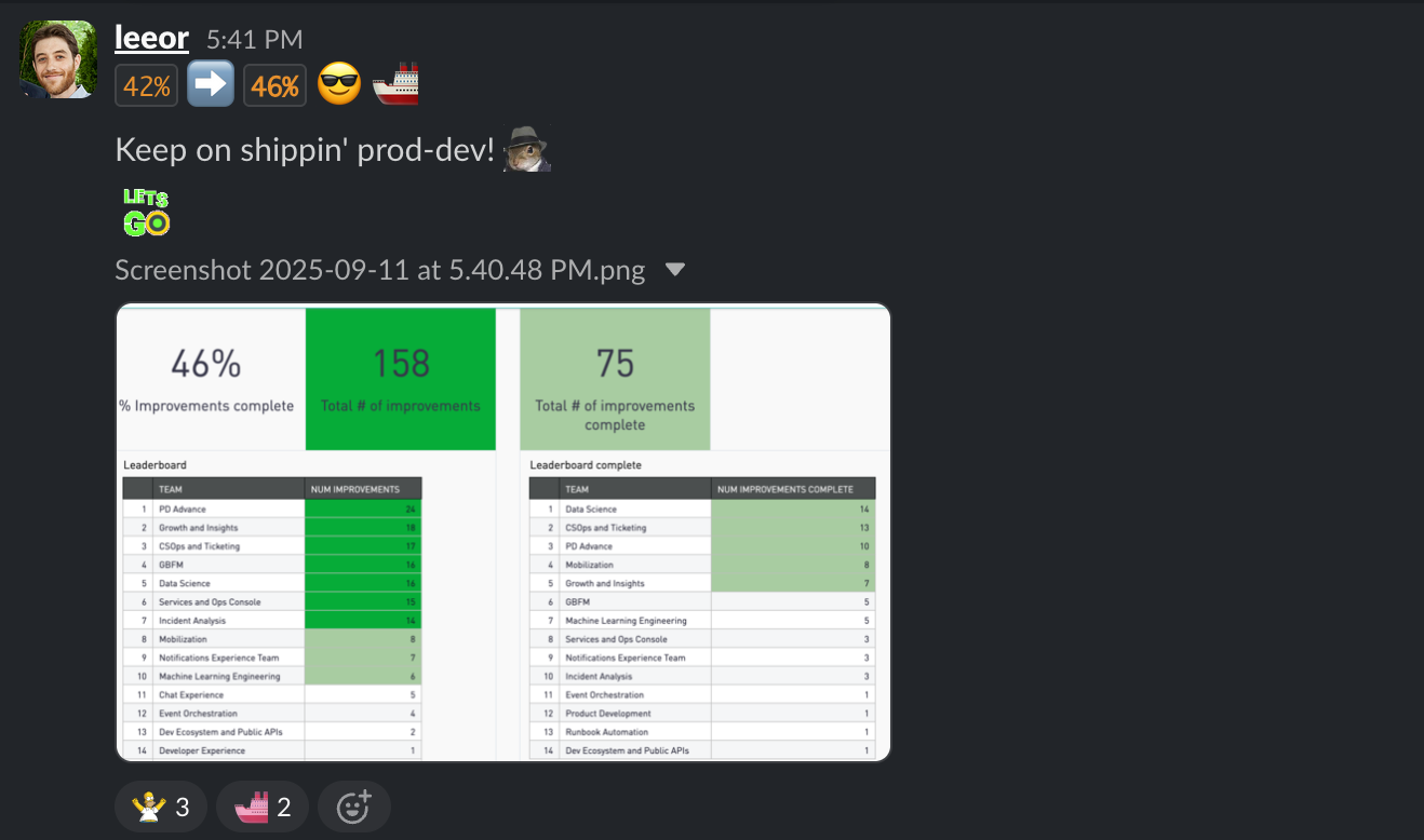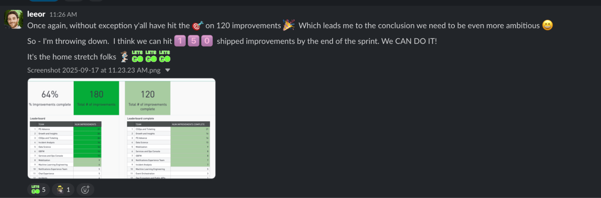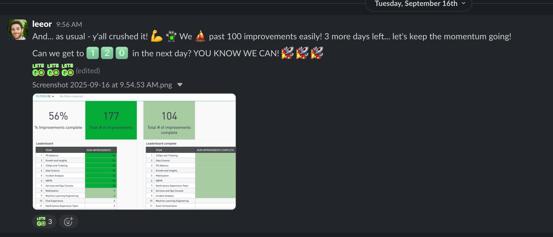In the spirit of having fun and driving some healthy competitive spirit across our teams, we decided to make a leaderboard to track and celebrate progress. Teams competed for the most improvements shipped.