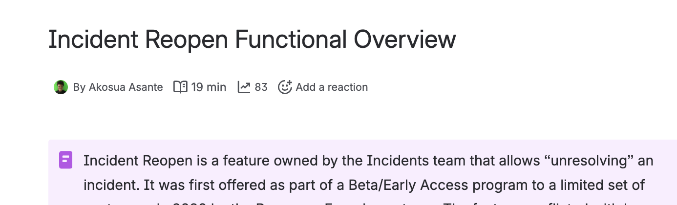 One thing I frequently champion with my teams is having strong documentation and functional specifications, especially for complex areas of our product. It just so happens that the Incidents team put together some truly excellent documentation describing the original reopen implementation earlier this year – its gaps, edge cases, and caveats required to enable it for more customers.