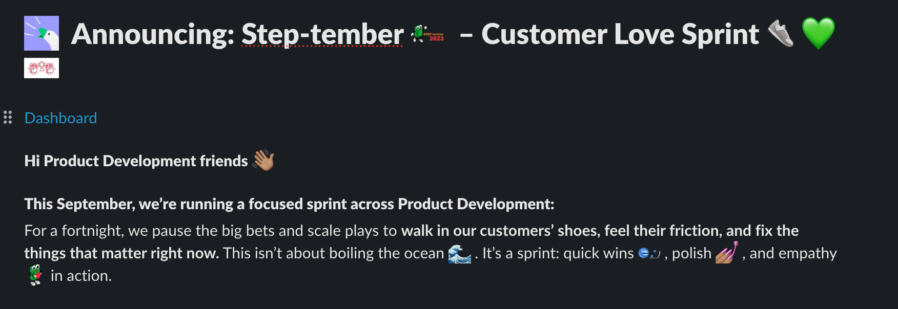 In the spirit of making many small steps that add up to something big, the timing and theme of Steptember felt right, so we called it the Step-tember customer love sprint:
