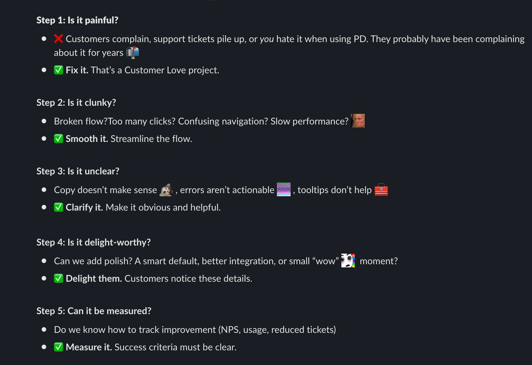 The sprint was all about customer love. It’s easy to get hyper-focused on innovations, shipping new stuff, and expanding the power of the platform (see AI agents!), but customers also have everyday pain points and friction with the core product. PagerDuty’s platform is incredibly powerful, but there are definitely areas where the product could be easier to use, address some long-standing pain points and just be more polished and delightful.
