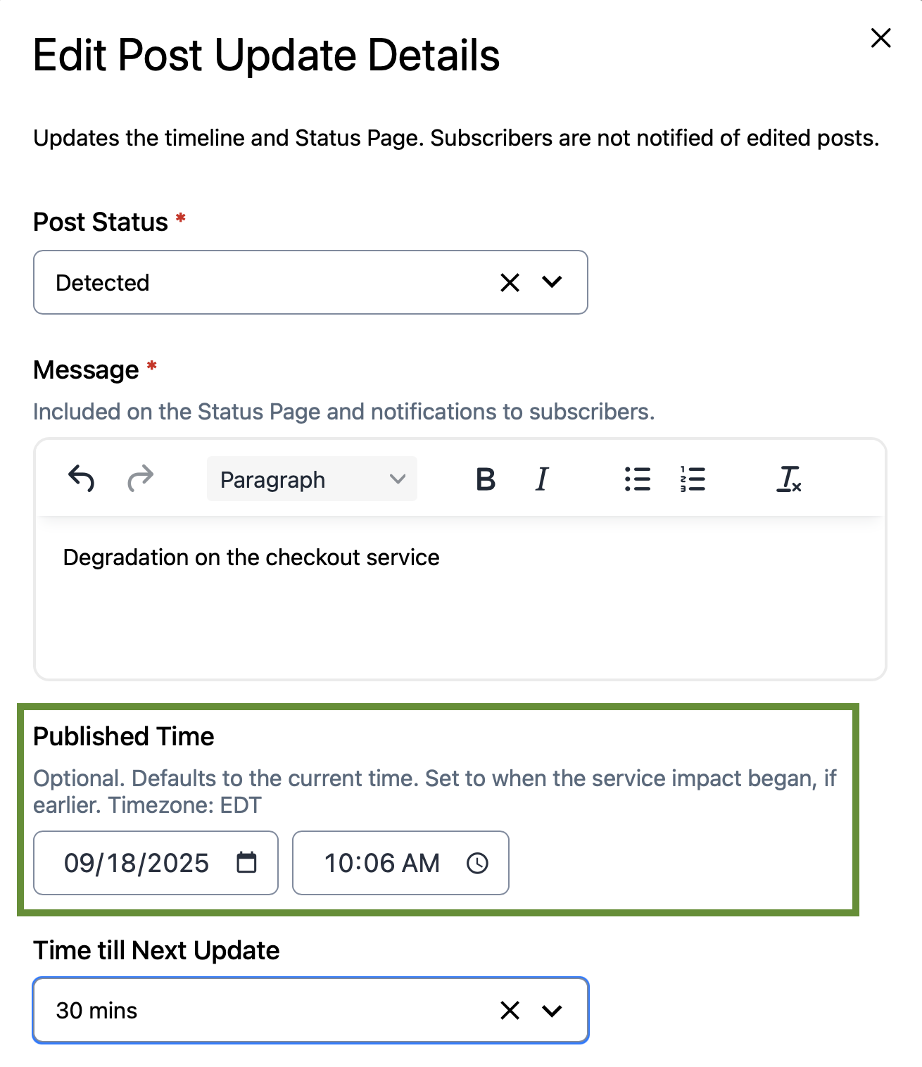 One frequently requested feature from customers (including us!) was the ability to retroactively set a post time for status page posts. As we discussed in our incident review, it would have been extremely helpful to have had this handy then, as we posted later than we would have liked.