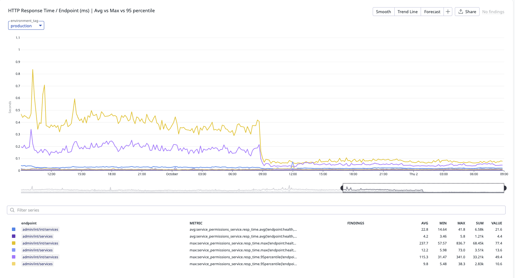 Another significant performance improvement we made was related to loading PagerDuty services (loading paginated lists of services and service-adjacent objects, service pick lists, etc) across the product, especially for accounts with large service topologies.