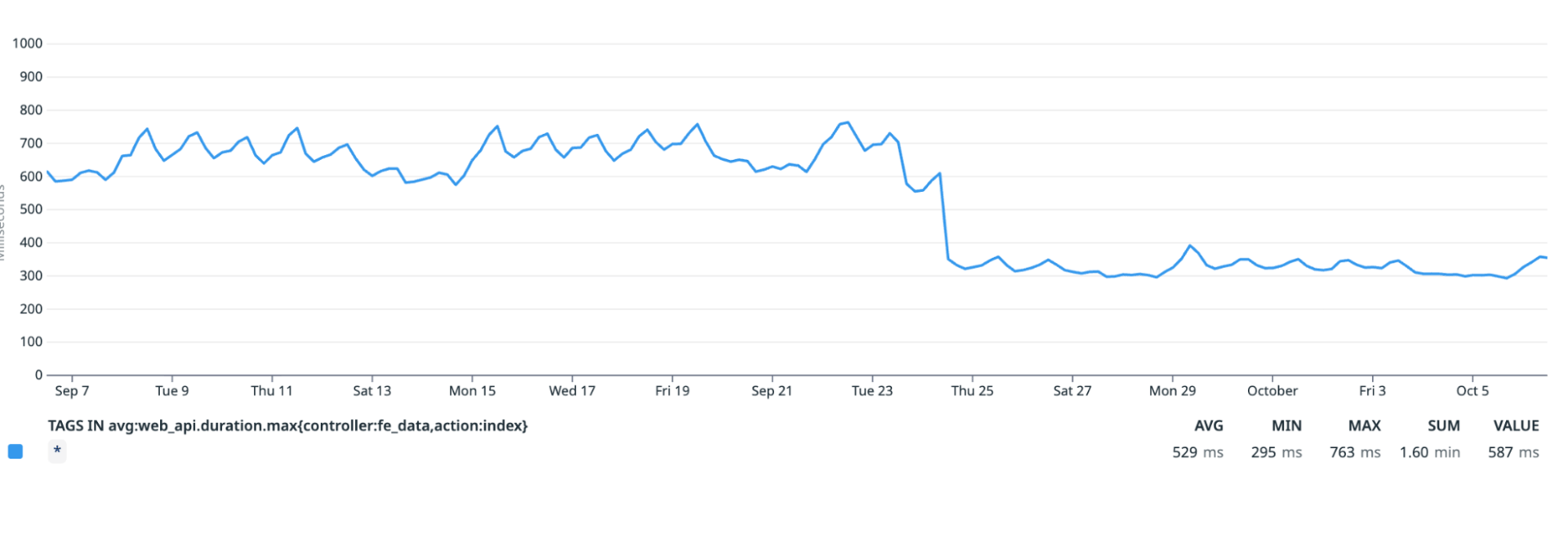 The team also noticed that some larger cache entries weren’t getting cached due to the configuration around max_item_size in memcached. Tweaking memcached configuration resulted in a significant improvement in performance for larger accounts. Taken together with the algorithm improvement, this resulted in >90% performance improvements in some cases! The graph speaks for itself: 🤩