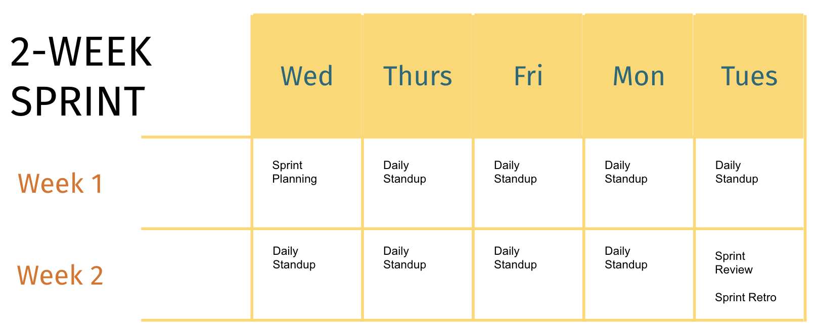 To prevent Monday fog and Friday holiday collisions, many teams choose to start and end their sprints mid-week. Here’s a sample sprint schedule for a scrum team:
