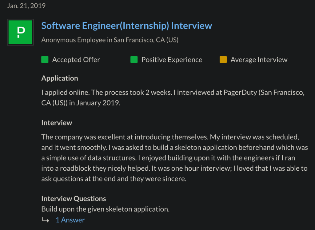Based on conversations with interns in the past, we’ve heard repeatedly that our old interview slot was too easy and not indicative of the type of work we do here at PagerDuty. After we had started testing the new interview, it wasn’t long before we got our first response from a candidate on Glassdoor.