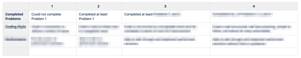 However, these new advantages came at a cost. As we began to train new interviewers, run mock interviews, and test the new process out in the wild, we soon realized that we needed a bit more structure than we initially thought. Every interview was different in some way, shape, or form, based on what the candidate brings into the session. As such, it was difficult as an interviewer to know where to start when evaluating candidates post-interview and to ensure that we were looking at the same criteria across interviewers and interview sessions. To combat this, we had decided to create a rubric, similar in structure to what you may have seen back in grade school. We list out typical areas to look out for on the Y-axis and levels of performance on the X-axis. Finally, we provide specific examples for each level and evaluation criterion. Of course, the rubric does not prescribe an evaluation, but instead acts as a guide for the interviewer.