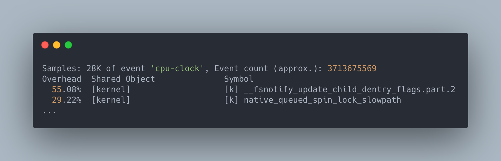 In this output, it looks like the kernel was spending a lot of time in __fsnotify_update_child_dentry_flags (55.08%), a function that updates flags on various objects. Before we go any further, let’s quickly talk about what these are and how they are used in the kernel.dentry