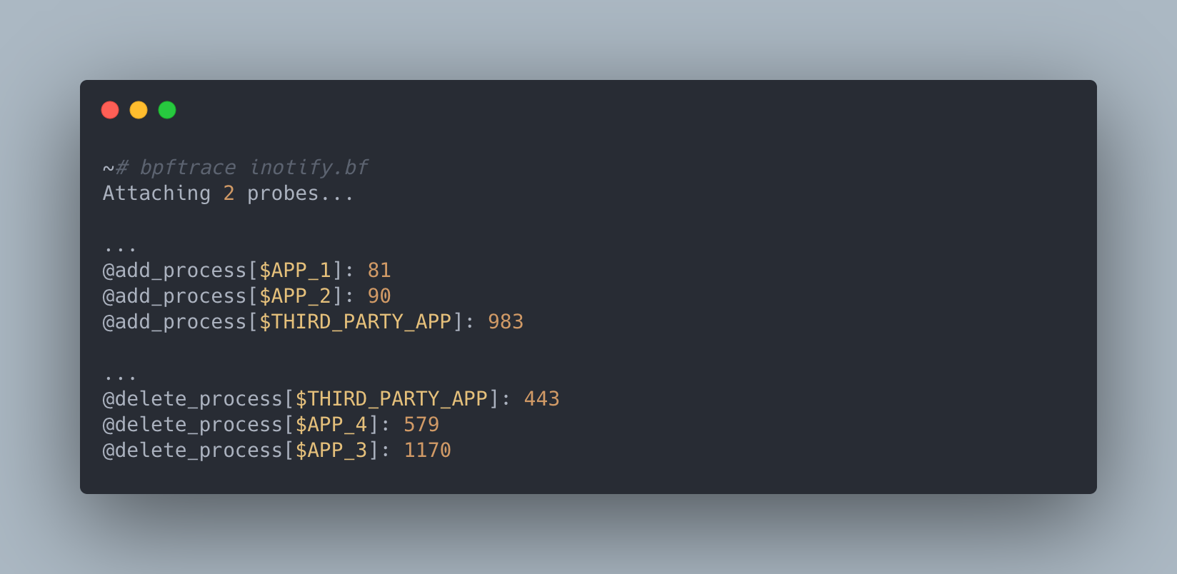 With the information that the size of the dentry cache is the source of our problems and that some application on this machine is creating these dentry objects on a continuous basis, we can now start to instrument the kernel to try to find the source application. To achieve this we used bpftrace a program that uses eBFP features present in more recent kernels (4.x) to trace and instrument kernel functions. We mostly chose it since it had the features we needed and was quick to get working; however, there are other alternative programs that can achieve similar results (ie: systemtap). We came up with the following script to try to find the source: