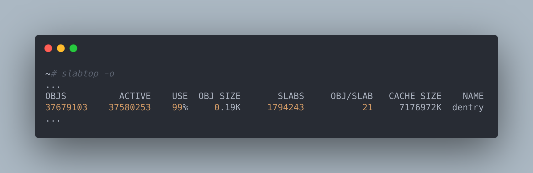So now we have some reasons why this function taking a long time to run is problematic, but why is it taking a long time to run in the first place? Since the number of files on the filesystem between an unaffected and affected machine were effectively identical, it didn’t really make much sense for this function to take so much longer unless there were significantly more entries being tracked by the problematic machines or there was some sort of contention issue. In order to rule out the first case, we decided to take a look at the slabtop command to determine how many dentry objects were actually being stored by the kernel.