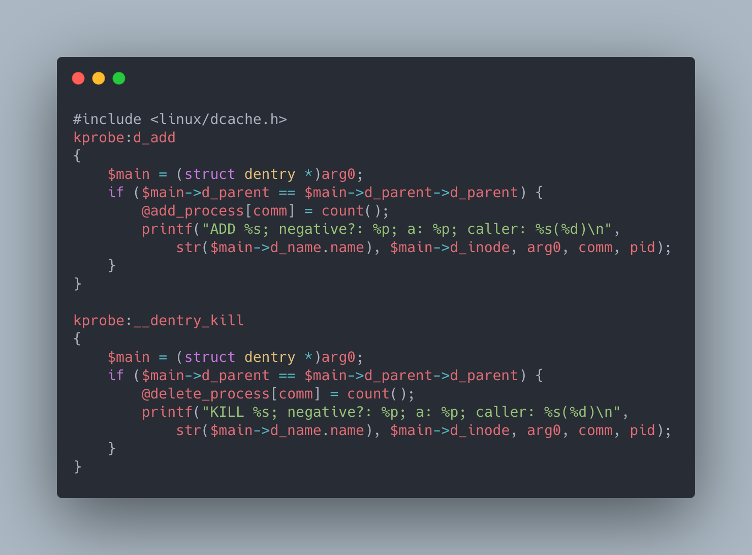 There are quite a few things going on here so let’s break it down. Here we are instrumenting the d_add function to track additions to the dentry cache and __dentry_kill function track removals to the cache. In order to reduce the amount of “noise” we get from other applications, we added an if statement to only find dentry objects that would end up on the / path. Next, we count() up all the calls made by comm (ie: the process that executed the sycall that got us here) and store them in an associative array (@..._process[...]) so that it is printed at the end of the run. Finally, in order to get an idea of what sort of dentry objects are actually getting created we print some information about each dentry as we encounter them including the name (ie: the path in the file system this dentry represents), if it’s in a negative state, and the inode it is associated with.