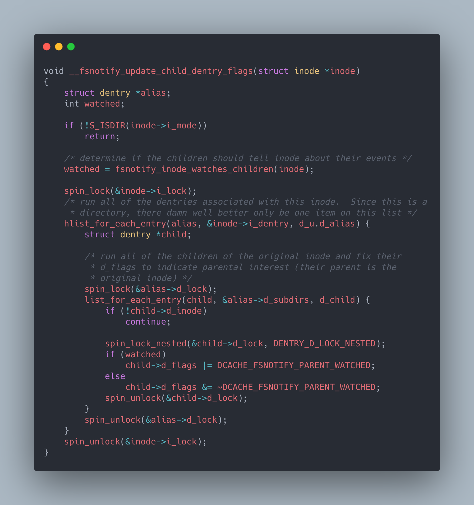 Now that we know what a dentry and dentry cache are let’s take a look at the kernel source of the __fsnotify_update_child_dentry_flags function to try to understand why the manipulation of dentry objects are leading to lockup issues: