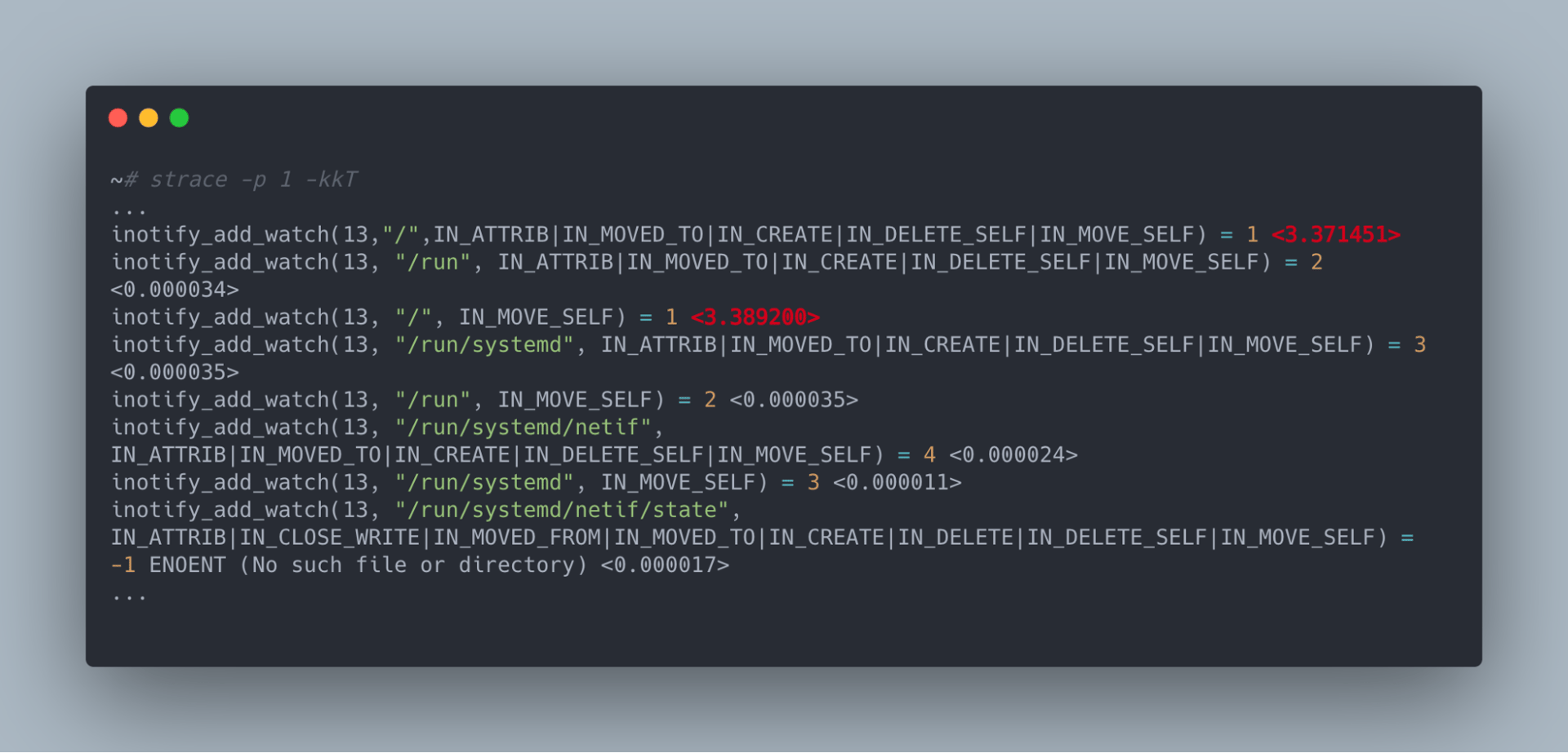 In this output, we can see all the syscalls being made systemd, the arguments to those syscalls, the return code of the syscall and most importantly how long the syscall took to execute. What immediately jumped out to us was that inotify_add_watch—specifically those on the / directory—seemed to take orders of magnitude longer than other inotify_add_watch calls. When we compared this to a machine unaffected by this issue, inotify_add_watch calls on the / directory were not special and took just as long as other directories.
