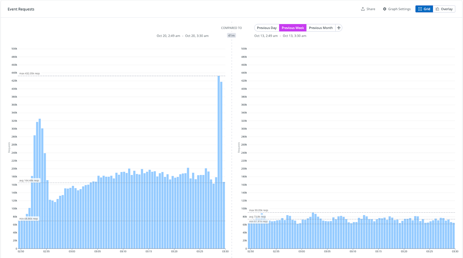 As the incident continued to unfold, we observed increased rates of events, incidents, and notifications. Our events and incident traffic typically remain at a stable baseline overnight, as this is generally a low-traffic period for most of North America. However, as shown in the graph below, our traffic spiked to at least three times the usual volume right at the beginning of the incident. From our end, the first signs of trouble began at 2:52 a.m. ET. This kind of increase is highly unusual unless a widespread issue is occurring. Below is a comparison of our traffic levels during the early stages of the incident with the same period the week prior.