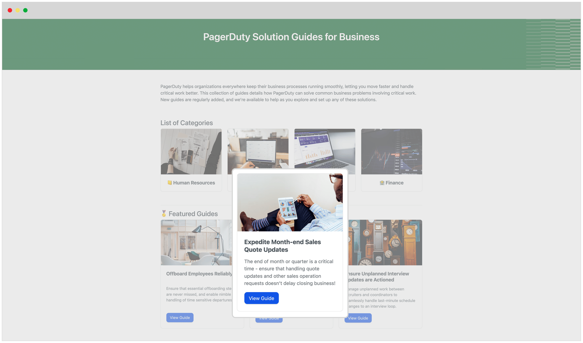 Did you know that PagerDuty can be used by departments outside of IT? That’s right! Check out the Solution Guides we’ve shared that help teams like marketing, sales, finance, human resources use PagerDuty to handle critical business functions.