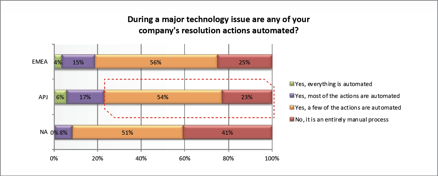 With all this talk of time-critical, unplanned work, most companies are still unprepared to deal with it. In North America, 90% of participants indicated they implement little or no automation in their incident response processes, with 40% reporting that their entire response process is manual. In APJ, 30% of respondents said their organizations have no automation in place for resolving major technology issues while over half (55%) say just a few of the actions are automated. In EMEA, the numbers also paint a dire story, with 81% of respondents saying that their companies have little or no automation for IT issue resolution.