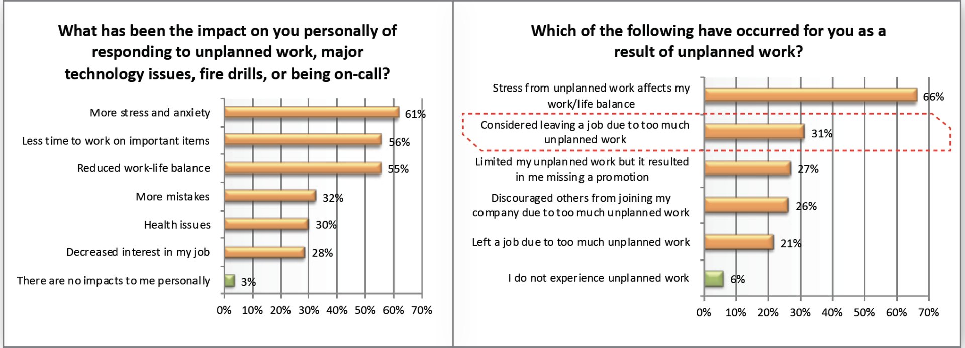The report shows that IT professionals globally have experienced an increase in unplanned work of over 100 hours per person per year—which can have dire implications for the business, especially when you take into consideration a large majority respondents indicated that diverting resources to unplanned work makes them less able to innovate and deliver on business priorities.