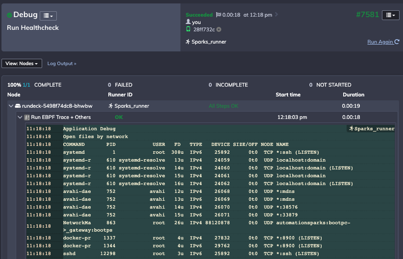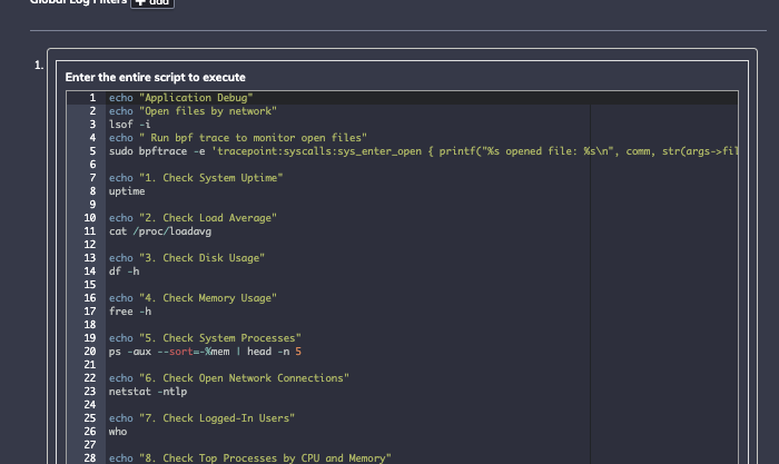 For the third use case, I need to deploy a set of bash commands to a remote machine and run again at the trigger event. This primarily surfaces diagnostics such as open files and network connections, but it also runs bpftrace, a tool that can be used for tracing specific calls: