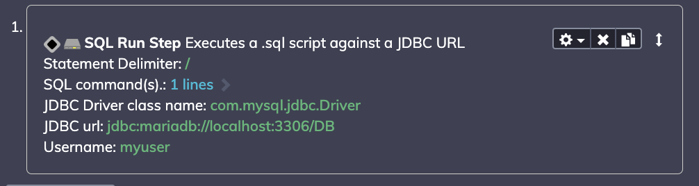 We can use the SQL RUN Step in Process Automation to add either an inline statement, or execute an existing script. As my application is MariaDB (A fork of MySQL), I can use the following parameters to run the MySQL query: