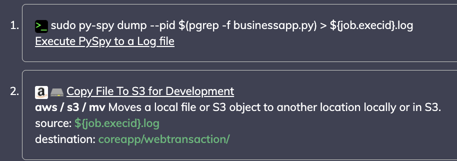 My observability tool is very quick to let me know WHEN an application has failed, but not always the information on WHY it failed. This second use case will run an ad hoc command for my python application to use py-spy, a sampling profiler for my application, in conjunction with one of our automation plugins to move files securely to S3 for later retrieval.