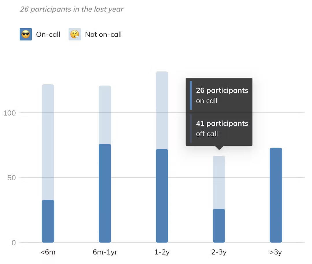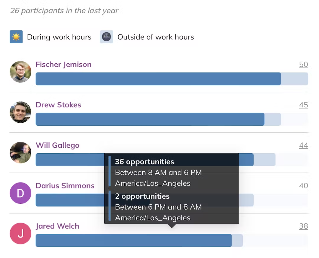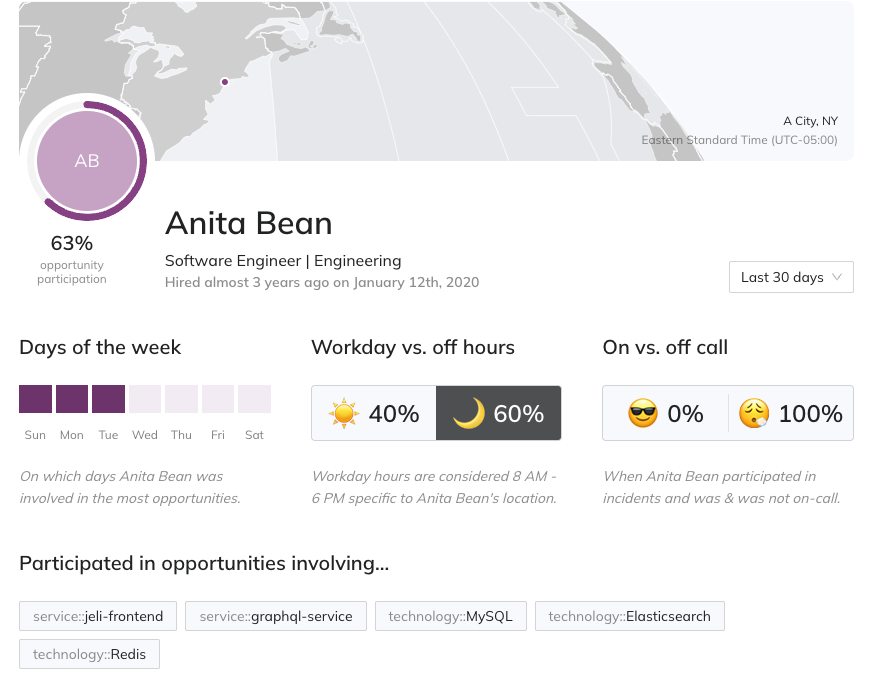 Who is most frequently involved in incidents? For which services? Are they responding during the day or after hours? Are they being pulled in for support while not on-call? What is the distribution of tenure for a particular service?