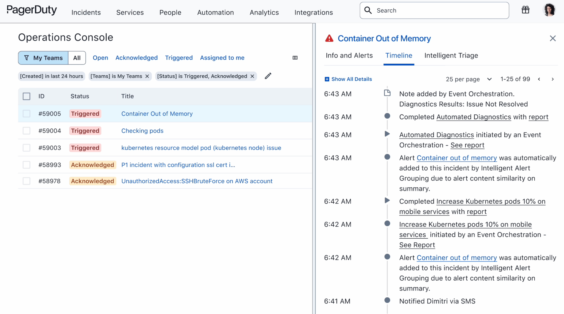 - Enhanced chat collaboration: PagerDuty Advance now seamlessly integrates with both Microsoft Teams (early access) and Slack to enhance collaboration.