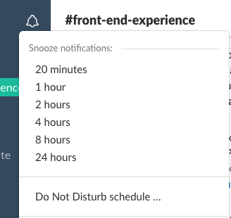 Lorsque je travaille en profondeur, j'utilise généralement la fonction Snooze de Slack, qui supprime les notifications pendant une durée déterminée. Je consulte ensuite Slack régulièrement lorsque je suis à un point d'arrêt pour m'assurer que tout est en ordre.