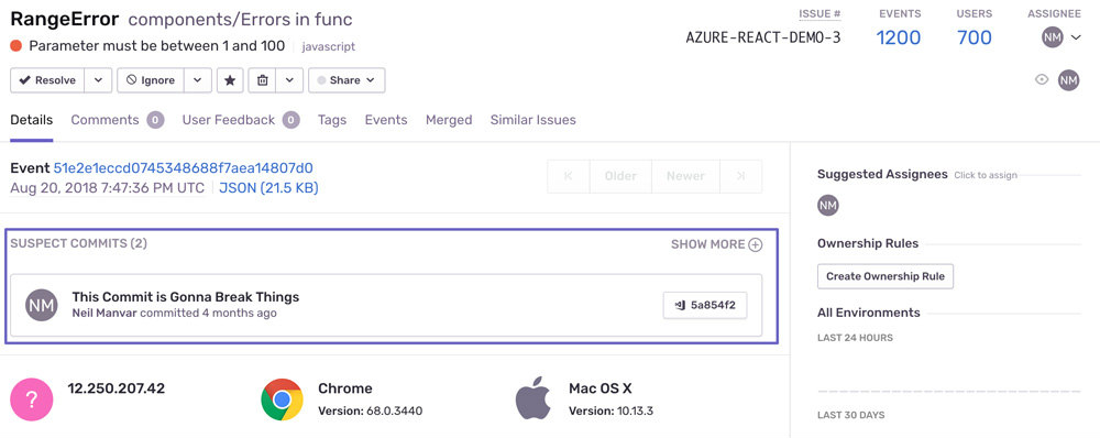 Sentry provides deep integrations with source code management platforms to uncover the commits that likely introduced the error—suspect commits.