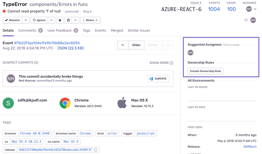 Sentry also suggests the developer who can best fix the problem.