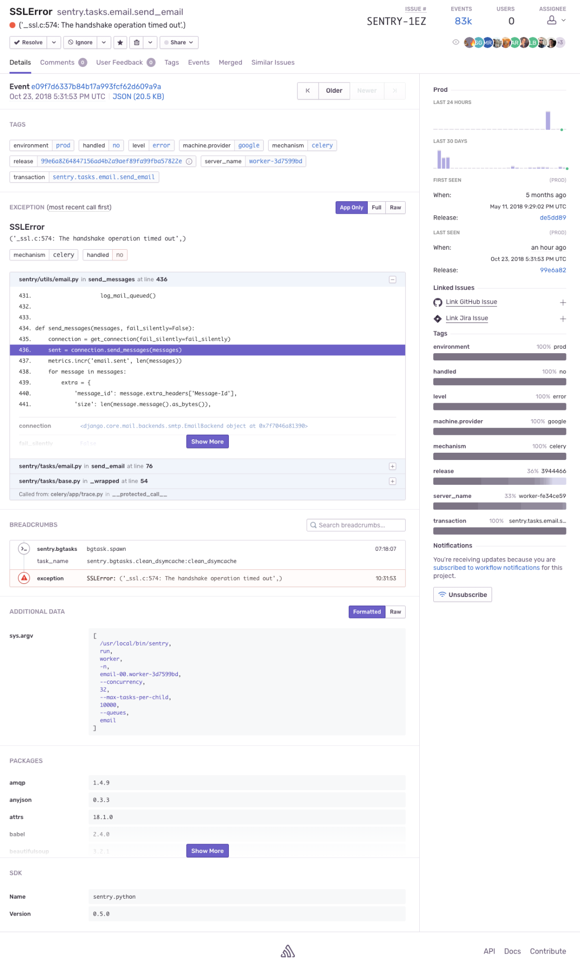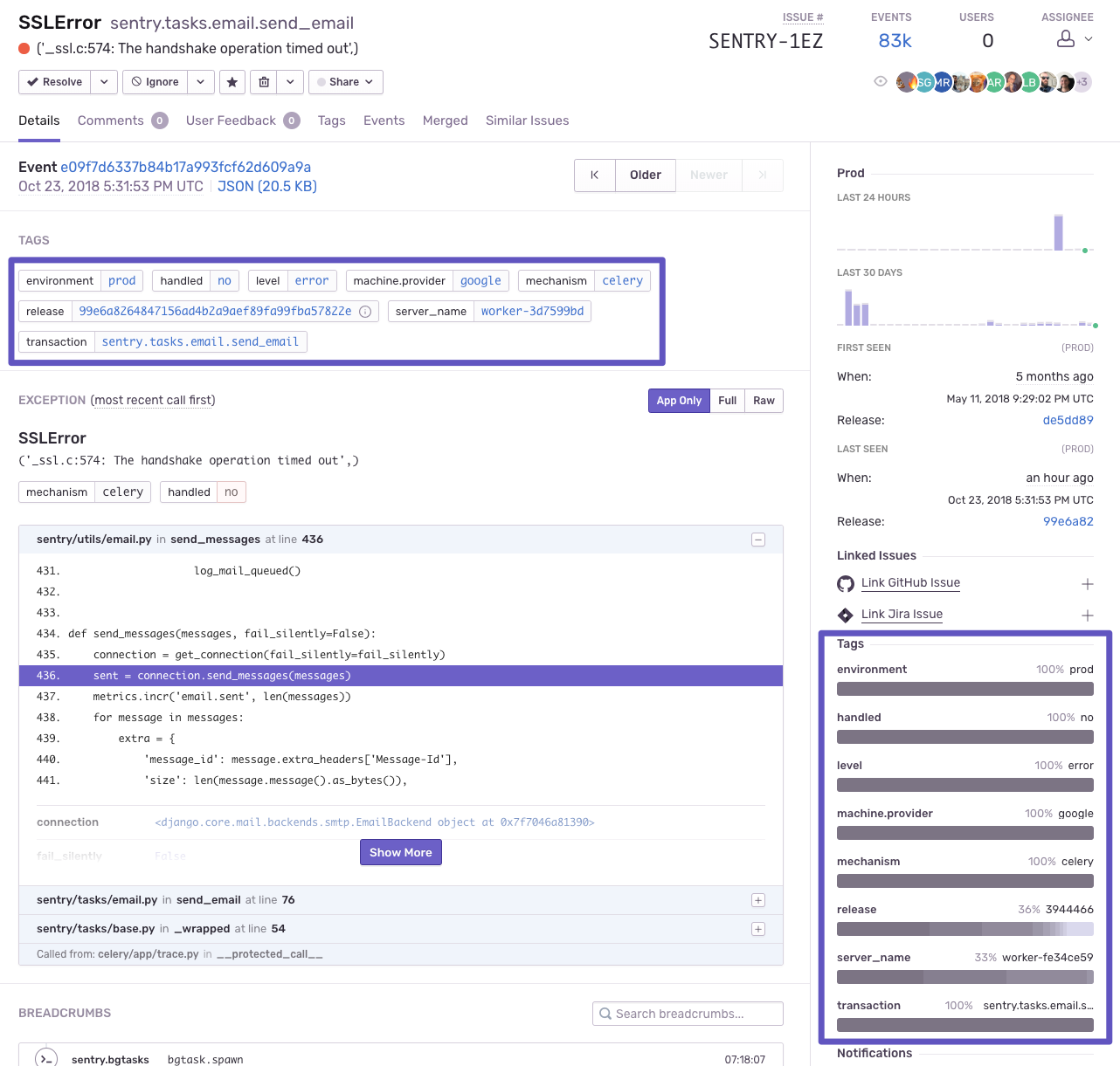 Sentry implements a system called tags—various key/value pairs that get assigned to an event—that are summarized at the issue level. You can save time and stress by avoiding the back-and-forth with your customers about their browser information by allowing tags to uncover the bug’s hotspots.