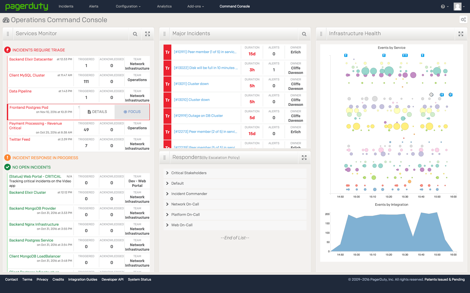 You can’t forget the importance of people when it comes to assessing the true health of your infrastructure. Tools will always do their job, but incidents are resolved by people that understand the data from those tools. PagerDuty’s Operational Command Console and Intelligence Applications bring these contexts from numerous vendors into a single view, providing a comprehensive look at which critical incidents are outstanding, which responders are currently working on incidents, which events are correlated, and much more in order to coordinate and orchestrate both technical and business response to incidents. PagerDuty makes it easy to visualize the health of applications, services, and infrastructure while managing incident response workflows all in one place.