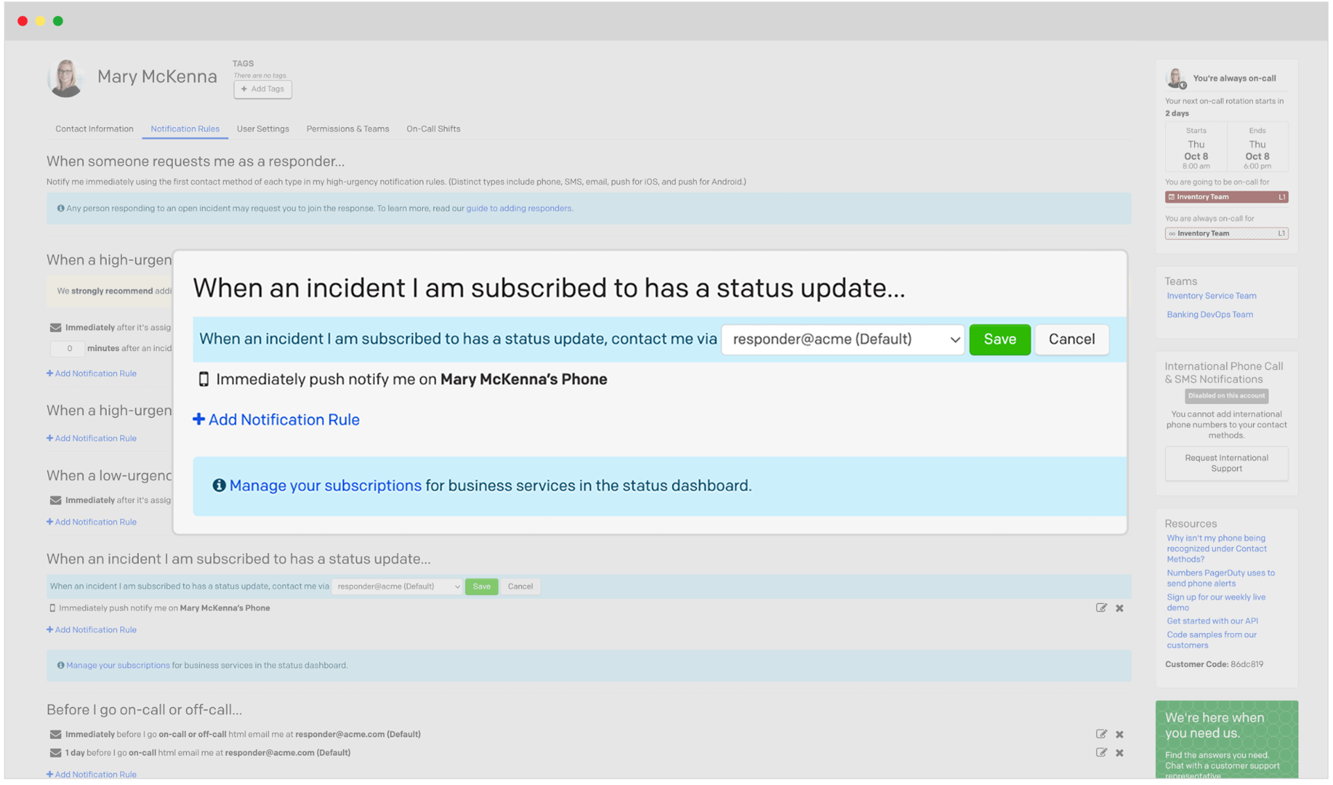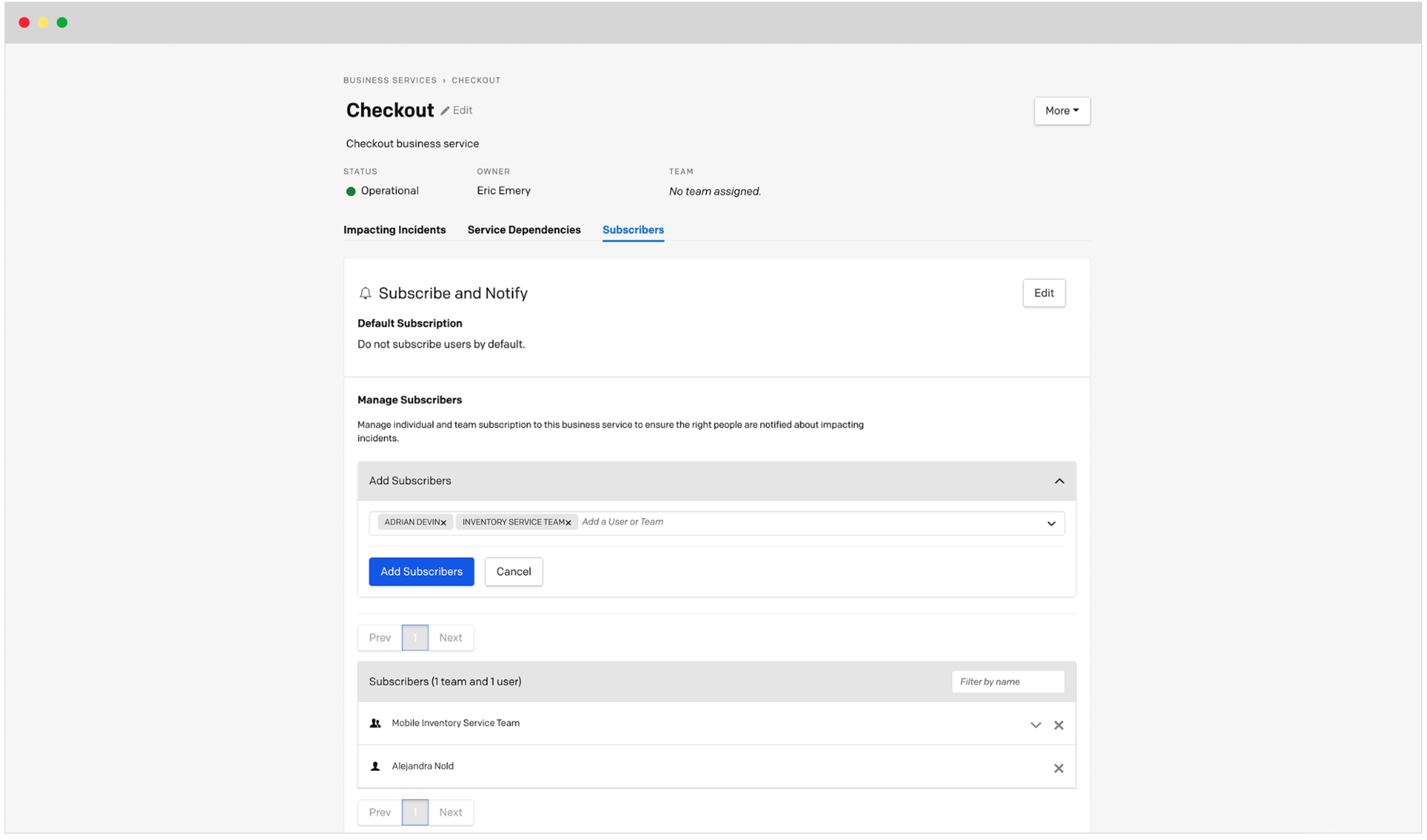 Votre processus de communication des incidents doit viser à partager les bonnes informations avec les bonnes personnes en temps réel. Mais face à la multitude de dépendances et de parties prenantes potentielles, comment y parvenir ? Avec les abonnements aux services métiers de PagerDuty , tout utilisateur abonné à un service recevra des notifications de mise à jour pour tout incident ayant un impact sur ce service. Tous les utilisateurs, y compris les parties prenantes disposant d'un accès limité, peuvent s'abonner eux-mêmes aux services métiers. Dans notre numéro de septembre, nous avons présenté les nouveautés suivantes : lancement de la plateforme Nous avons annoncé que les gestionnaires de comptes et les administrateurs peuvent également gérer les abonnements aux services professionnels pour d'autres utilisateurs et équipes, et peuvent même spécifier que tous les utilisateurs existants et futurs soient abonnés par défaut à des services professionnels spécifiques.