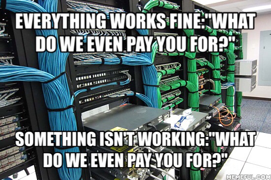The reality is that all of us rely heavily on Systems Administrators and everyone else who work behind the scenes. Our everyday lives and ability to get things done depend on them. It is easy to not notice these individuals, as they are rarely the ones that get credit when something runs smoothly. The only time they tend to get caught in the spotlight is when something goes wrong.