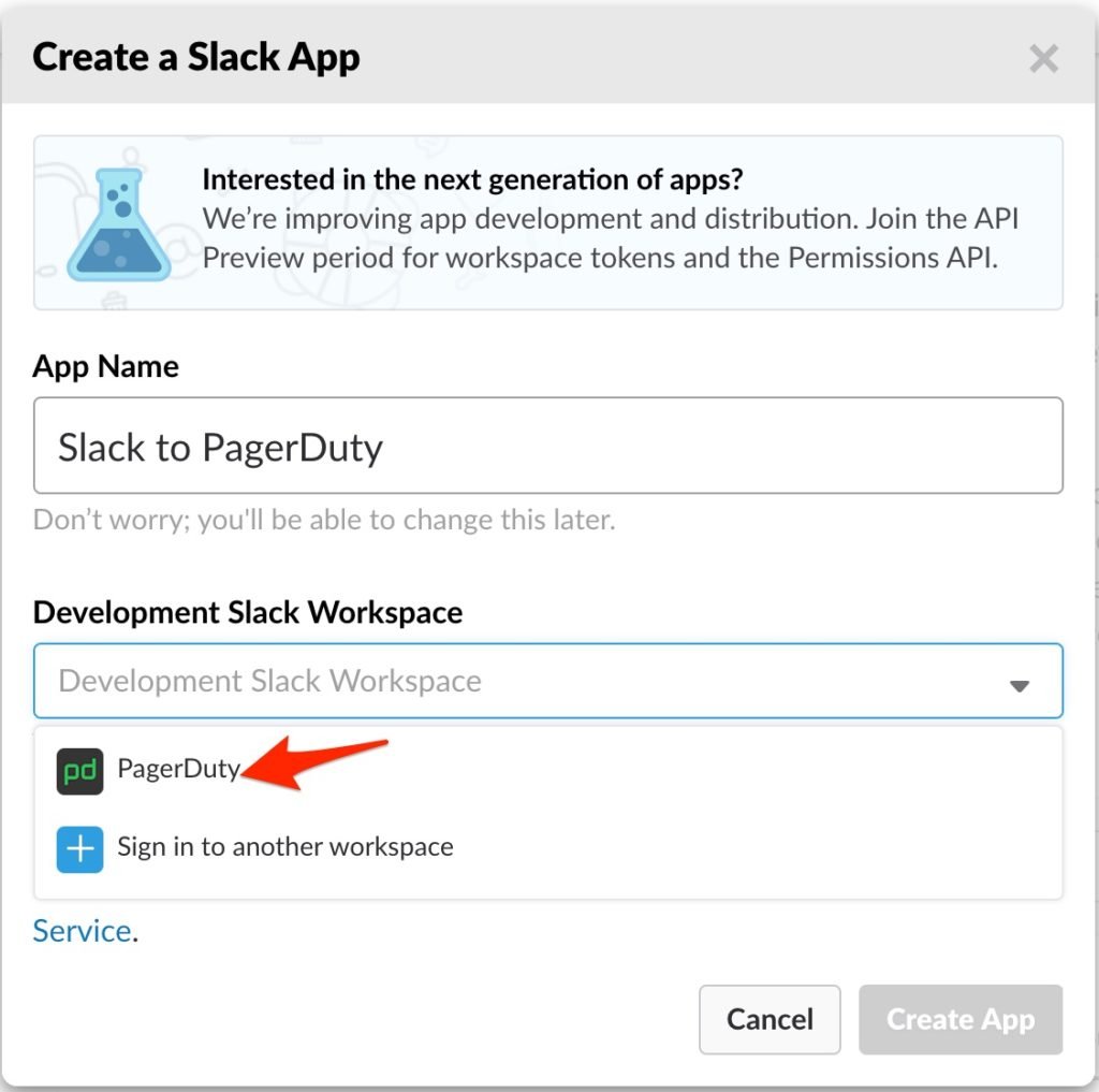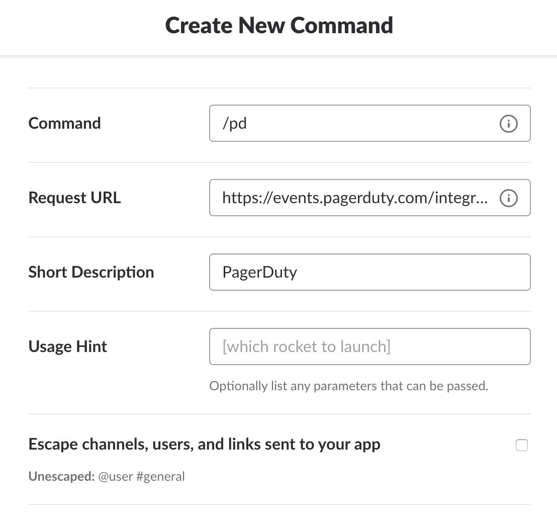 NOTE :Cette intégration déclenche des incidents PagerDuty depuis Slack et est destinée à compléter le Slack v1 extension héritée. Nous avons depuis mis à jour notre offre d'intégration Slack avec une extension Slack V2, qui inclut les fonctionnalités de l'extension Slack v1, des commandes slash /pd intégrées (dont une pour déclencher des incidents depuis Slack), ainsi que d'autres fonctionnalités vous permettant de travailler directement depuis Slack. Veuillez consulter la version la plus récente. Guide d'intégration Slack V2 pour plus de détails.