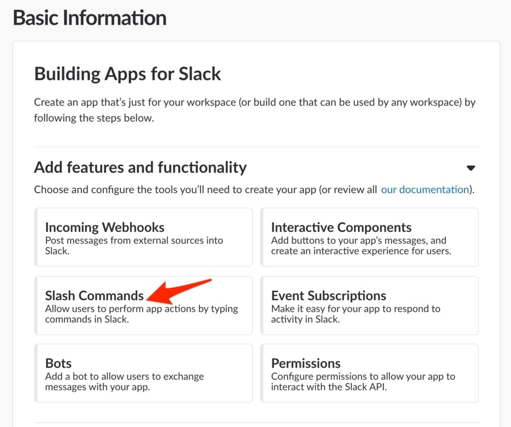 - Sous Ajouter des fonctionnalités et des fonctionnalités , cliquez Commandes Slash et puis Créer une nouvelle commande.