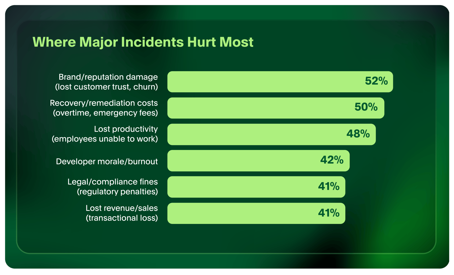 - Disruptions have become a board-level financial risk. Some organizations (8%) lose more than $1 million per hour, 34% lose at least $500,000 per hour, and more than two thirds (68%) lose more than $300,000 per hour during IT incidents. The cost of disruptions have grown too high for leaders to ignore and the impact extends beyond immediate revenue loss to damaging brand reputation (52%), introducing recovery costs (50%), reducing productivity (48%) and contributing to developer burnout (42%).